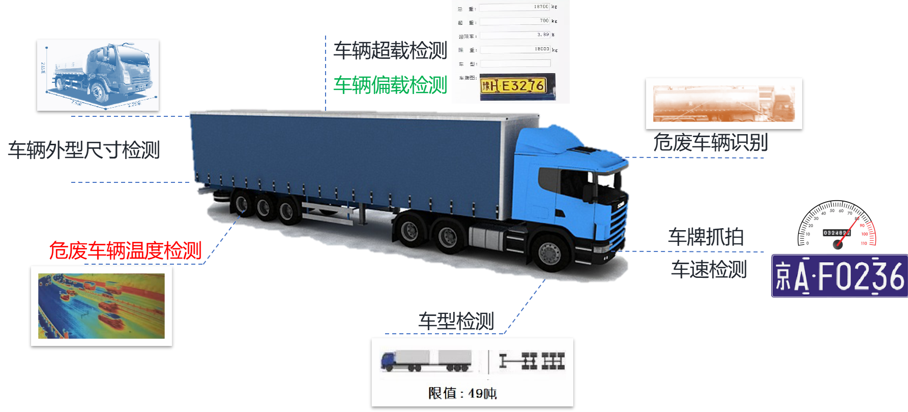 自動(dòng)識(shí)別車輛重量、號(hào)牌及車輛特征,檢驗(yàn)車輛合法身份,自動(dòng)核對黑名單、自動(dòng)報(bào)警
